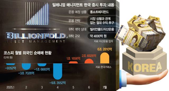 5일 금융투자 업계에 따르면 밀레니엄은 빌리언폴드자산운용에 총 4000억 원 규모의 자금을 위탁할 예정인 것으로 알려졌다. 빌리언폴드자산운용이 밀레니엄 맞춤형으로 위탁 자금을 관리하는 방식이다. 밀레니엄이 국내 상장사 투자를 위해 자산운용사에 자금을 위탁한 것은 이번이 처음이다. 밀레니엄은 빌리언폴드자산운용이 운용하던 2500억 원의 배에 가까운 4000억 원을 맡겼다. 금융투자 업계의 한 관계자는 “글로벌 펀드의 자금 위탁 규모는 운용 성과에 따라 늘어나는 경우가 일반적”이라고 말했다.
