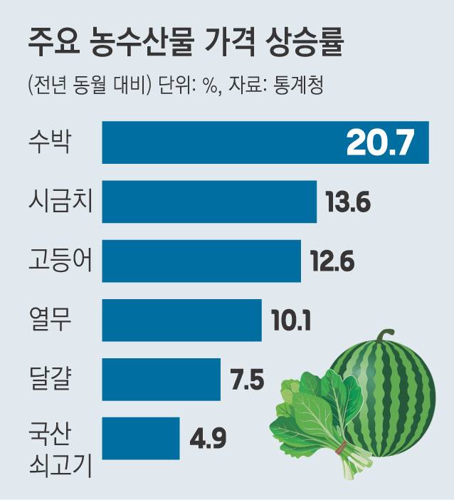 폭염·폭우 등 이상기후로 제철 채소·과일류 상승폭도 두드러졌다. 시금치(13.6%), 열무(10.1%), 깻잎(9.5%) 등 더위에 취약한 품목을 중심으로 전년 대비 물가가 크게 올랐다. 전월 대비로 보면 시금치(78.4%) 열무(57.1%) 등의 상승폭이 컸다. 이른 더위로 수요가 급증한 수박(20.7%)도 1년 전보다 가격이 크게 올랐다.