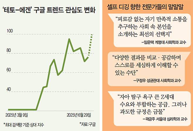 일종의 시대적 요인이 작용했다는 분석도 있다. 한국 사회는 ‘치열한 경쟁’으로 점철돼 있다. 젊은층은 스스로 ‘내가 누구인지, 나는 어떤 사람인지’ 고민할 시간조차 없이 경쟁에 몰두한다. 경쟁을 하다 보면 어느 순간 궁금증이 찾아온다. 스스로에 대한 의문이다. 최근 ‘셀프 디깅(Self-digging)’ 유행어가 생긴 이유다. 셀프 디깅은 자신의 가치관, 성격, 외모, 취향 등에 집중하는 것을 의미한다. 곽금주 서울대 심리학과 교수는 Z세대의 자아 탐구 욕구는 과거 어느 세대보다도 큰 편이라고 봤다. 개인의 삶이 중요한 세대이기 때문이다. 실제로 전국 19~59세 1000명을 대상으로 실시한 엠브레인 트렌드모니터 조사에 따르면, 20대(76%)와 30대(71.6%) 응답자 중 다수가 ‘나에 대해 정확히 알고 싶다’고 답했다. 그러나 ‘자신을 잘 안다’고 느끼는 비율은 20대 22.4%, 30대 36.8%에 그쳤다. 곽 교수는 “욕구가 큰 상황에서 5분 정도만 투자하면 본인을 규정하고 판단할 수 있는 진단 콘텐츠가 범람하는 환경이 갖춰졌다. 쉽게 말하면 수요와 공급이 완전히 맞아떨어진 것”이라고 말했다.