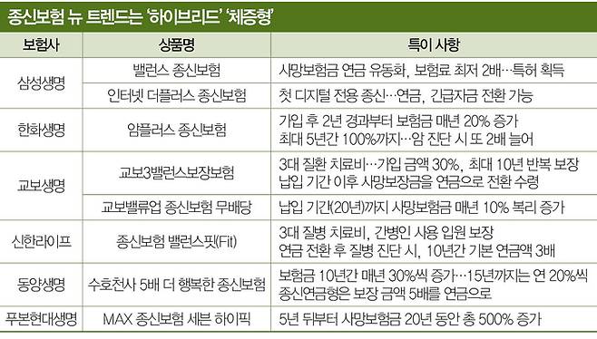 생보 업계는 기존 종신보험을 대폭 손질해 고객의 관심을 되돌리기 위해 안간힘이다. 기존 종신보험에 중대 질환 보장과 연금 기능을 추가한 ‘하이브리드 종신’, 또 일정 기간 가입을 유지하면 보험금을 늘려주는 ‘체증형 종신’을 화두로 내세웠다.