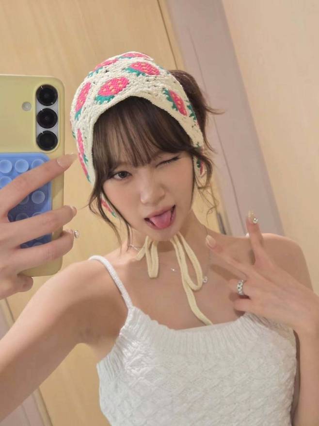 사진 속 김채원은 스트로베리 디자인의 니트 헤어 스카프를 착용하고 있다. 헤어 스카프는 그의 귀여운 이미지를 더욱 부각시키며, 카메라를 향한 윙크와 혀를 내미는 등의 장난스러운 표정은 사랑스러운 분위기를 전달한다.