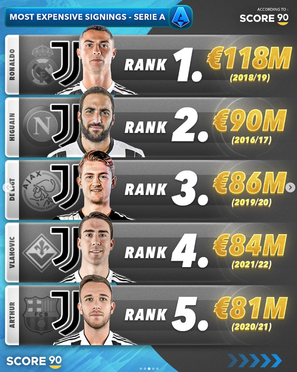 ‘스코어 90’은 이탈리아 세리에 A 역대 가장 비싼 이적료 TOP5을 공개했다. 5명 모두 유벤투스가 싹쓸이 했는데, 여전히 1위는 호날두의 1억 1800만 유로(약 1895억 원)였다.