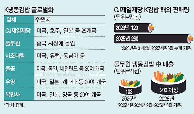 진입장벽이 높다고 알려진 중국에서도 K냉동김밥은 흥행하고 있다. 풀무원은 지난해 9월 ‘중국 코스트코’로 불리는 현지 창고형 대형마트 ‘샘스클럽’ 54개 전점에 자사 냉동 참치김밥 1종을 입점시켜 중국 시장 선점에 집중하고 있다. 출시 이후 올해 6월 말까지 누적 판매금액은 5300만위안(약 103억원)에 달한다. 풀무원 관계자는 “연간 186만줄 판매 목표롤 이미 달성했고, 상반기 중국법인 매출도 전년보다 30% 늘었다”며 “내년 중으로 제품을 4종으로 늘리고 한식 카테고리로 확장해 매출도 2배 이상 늘릴 것”이라고 했다.
