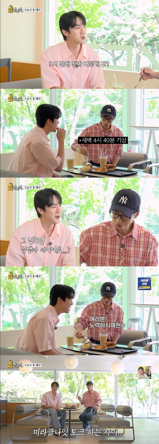 '틈만 나면,' 유재석이 새벽 기상 루틴을 공개해 유연석을 놀라게 했다.