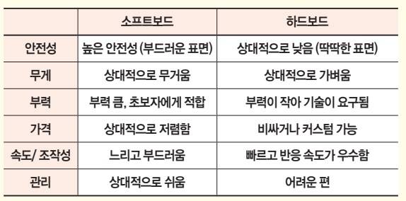 입문자라면 안전성과 내구성이 뛰어나고 비교적 다루기 쉬운 소프트보드(폼보드/ 소프트탑)가 적합하다. 대부분 서핑숍의 대여 보드가 소프트보드인 이유다. 반면 서핑 경험이 어느 정도 쌓이고 속도와 조작성, 기동성이 중요해지면 하드보드가 더 큰 만족을 준다. 하드보드로는 더욱 다양한 기술을 시도해 볼 수 있다. 다만 하드보드는 충격에 약하고 관리가 필요하므로 주의해야 한다.