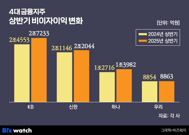 4대 금융지주의 올 상반기 당기순이익이 10조원을 돌파하며 또 다시 역대 최고치 기록을 경신했다. 금리 인하 기조 속 이자이익이 주춤했지만 비이자이익이 1년새 7% 넘게 증가하며 도약을 도왔다. 리딩금융지주인 KB금융이 이자·비이자이익을 막론하고 존재감을 과시했다.