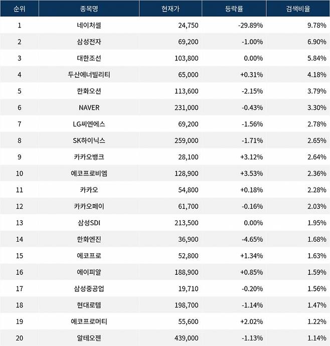 이 밖에도 에코프로머티(450080) ▲2.02%, 에코프로(086520) ▲1.34%, 카카오(035720) ▲0.18%, 두산에너빌리티 ▲0.31%, 에이피알(278470) ▲0.85%, 삼성중공업(010140) ▼0.20%, 카카오페이(377300) ▼0.16%, 알테오젠(196170) ▼1.13%, 현대로템(064350) ▼1.14%, 한화엔진(082740) ▼4.65% 등이 많이 검색되고 있다.
