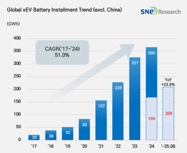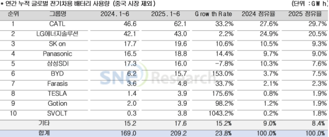 SNE리서치는 올해 1~6월 판매된 글로벌(중국 제외) 전기차(EV·PHEV·HEV)에 탑재된 총 배터리 총 사용량은 약 209.2기가와트시(GWh)로 전년 동기 대비 23.8% 성장했다고 6일 밝혔다.