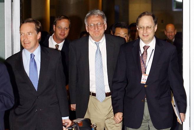 [2006년 대북협의를 위해 방한한 로버트 조지프 전 미 국무차관(가운데) (연합뉴스 자료사진)]