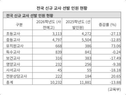 교육부는 6일 전국 17개 시·도교육청이 공개한 2026학년도 유·초·특수·중등 신규교사 임용시험 사전예고 현황을 발표했다.