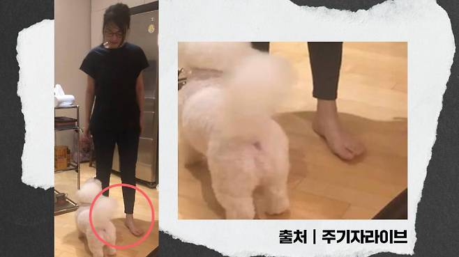 ◇ 김현정> 맨발로 어딘가 실내 마룻바닥을 딛고 서 있는데 옆에 이제 강아지 한 마리 있고. 저 발 언뜻 봐도, 옆에 이제 비숑이죠. 비숑하고 비교해 봤을 때 사이즈가 가늠이 되는데 최소한 250~260은 안 돼 보이기는 하네요, 언뜻 봐도.
