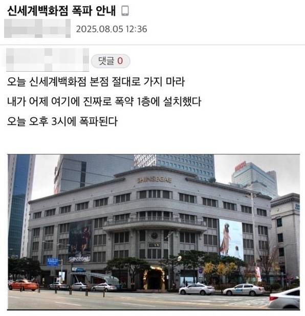 테러 글 게시로 신세계백화점 직원과 고객 등 수천 명이 건물 밖으로 피신했고, 경찰특공대가 긴급히 출동해 폭발물 확인에 나섰다.