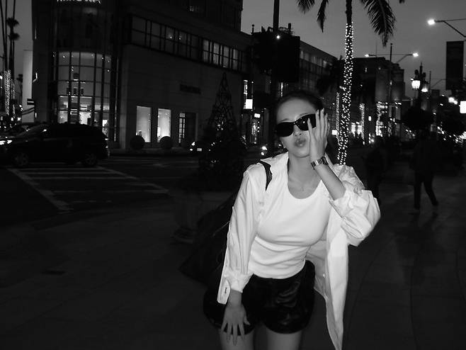 흑백으로 담긴 밤 거리에서의 안유진은 전혀 다른 분위기를 자아낸다. 루즈한 화이트 셔츠를 매치해 편안한 스트리트 무드를 완성했고, 흑백임에도 불구하고 안유진의 확실한 존재감이 드러난다.