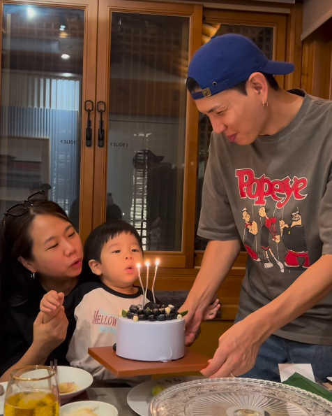세 번째 생일을 맞은 아들을 위해 홍현희와 제이쓴은 꿀이 떨어지는 눈빛으로 생일 축하 노래를 불러주고 있으며 초를 부는 준범이의 모습이 귀여운 매력을 더한다.