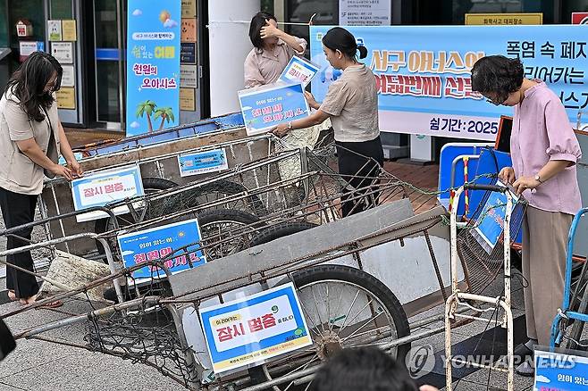 (광주=연합뉴스) 6일 오전 광주 서구청 야외광장에서 폐지 수집 노인들이 맡긴 리어카를 직원들이 정리하고 있다. 서구는 8월 한 달 동안 리어카를 맡긴 노인들에게 인당 최대 50만원의 쉼 지원비를 전달하는 프로젝트를 시행하고 있다. 2025.8.6 [광주 서구 제공. 재판매 및 DB 금지]