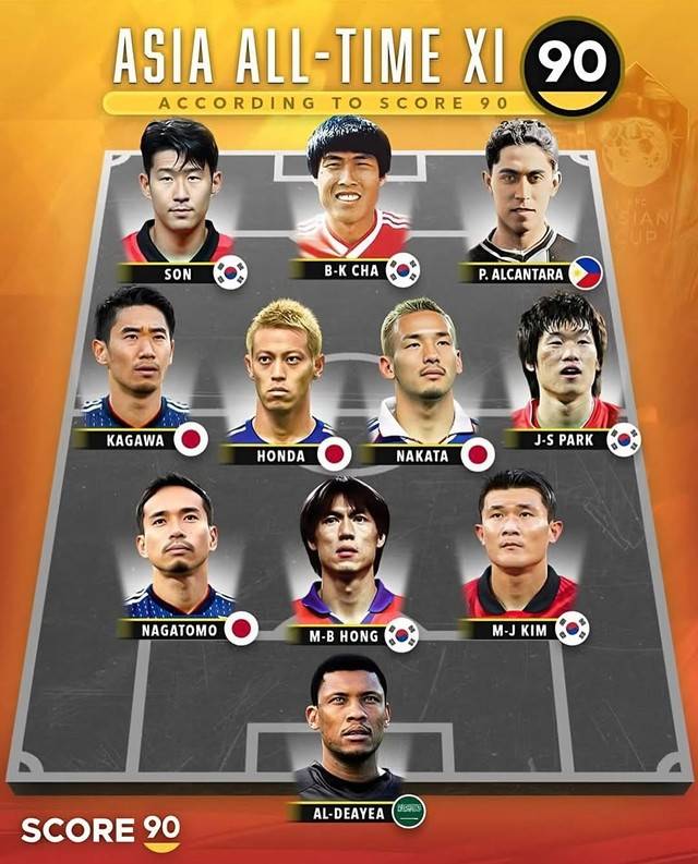 해외 축구 매체 '스코어 90'은 최근 아시아 축구의 역대 베스트 11 선수 명단을 발표했다. 4-3-3 포메이션을 기준으로 공격수 3명, 미드필더 4명, 수비수 3명, 골키퍼 1명이다.