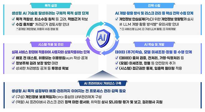 생성형 AI 서비스가 개발되고 활용되는 상황은 넓게 △목적 설정의 단계 △전략 수립의 단계 △AI 학습과 개발의 단계 △AI 시스템을 적용하고 관리하는 단계 등 4단계로 나눠 고려할 수 있다. 물론 각각의 단계에서 고려해야 할 개인정보 관련 사항들은 상당히 다양한 형태로 나타날 수 있다.