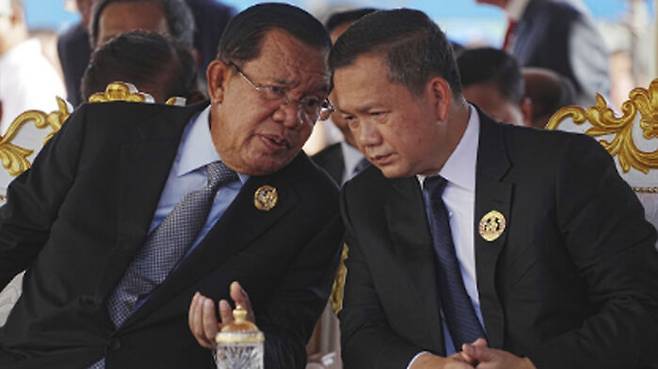 ▲ 캄보디아 실권자인 훈 센 상원의장(왼쪽)과 아들 훈 마네트 총리