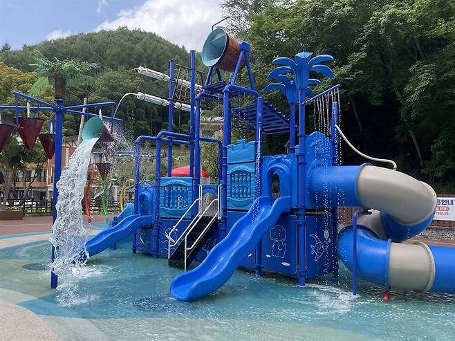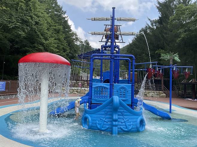 어린이들은 산림휴양관 본관 가까이 울창한 대나무 숲옆 해적선 형태의 물놀이 시설에서 싱글벙글했다. 올해 처음 개장한 어린이 물놀이 시설인데, 수요일부터 일요일까지 오전 10시부터 오후 5시까지 개장한다. 이 물놀이 시설은 낮 12시부터 오후 1시 30분까지 한낮의 더위를 피하고 어린이들의 점심 시간및 충분한 휴식을 배려하기 위해 쉰다.