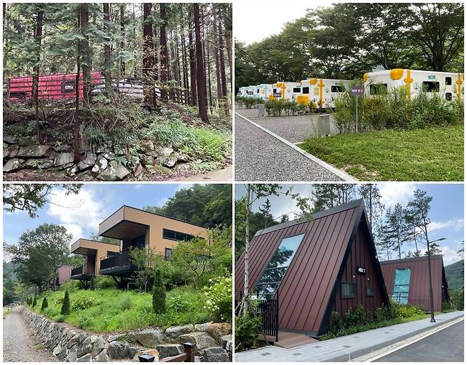 | ▲ 임실 성수산 왕의 숲, (위 왼쪽) 편백 숲 캐빈하우스, (위 오른쪽) 숙소용 카랴반 , (아래 왼쪽) 숲속의 집 네모, (아래 오른쪽) 숲속의 집 세모 |