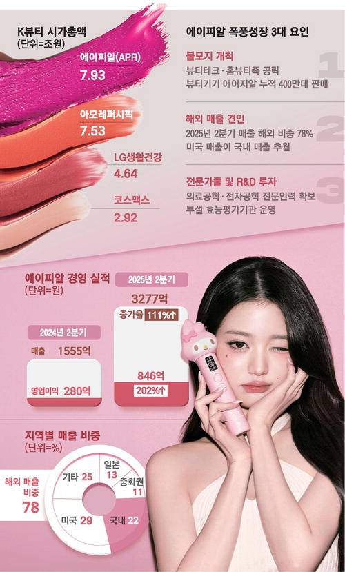 글로벌 뷰티기업 에이피알(APR)이 K뷰티 시가총액 1위에 등극했다. 지난 6월 LG생활건강을 추월한 지 2개월도 지나지 않아 아모레퍼시픽까지 따라잡은 것이다. 6일 업계 전문가들에 따르면 에이피알의 폭발적 성장 비결은 불모지 개척, 해외 진출 성공, 강력한 연구개발(R&D) 경쟁력 등 세 가지로 요약된다.