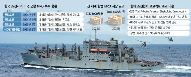 미 MRO 시장에서 쌓인 경험은 글로벌 MRO 시장 진출로 이어질 가능성이 크다. 함정 MRO는 이익률이 15~20%에 육박하는 고수익 사업이다. 조선사들도 이 점을 염두에 두고 우방국 해군과 논의를 이어가고 있다. 시장조사 업체 모도인텔리전스에 따르면 세계 해군 함정 MRO 시장 규모는 2024년 577억 6000만 달러(약 77조 5000억 원)에서 2029년 636억 2000만 달러(약 88조 5000억 원)로 성장할 것으로 전망된다.
