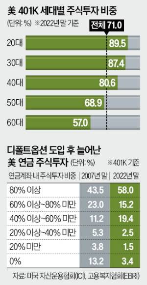 미국에서 디폴트 옵션이 활성화한 건 2006년부터다. 연금보호법상 기업이 운용 손실에 책임을 지지 않아도 된다는 점이 명시되면서다. 디폴트 옵션 도입 초기인 2007년만 해도 연금에서 주식을 전혀 담지 않은 투자자가 13.2%를 차지했지만 2022년엔 이 비중이 3.4%로 줄었다. 이병선 모건스탠리 퇴직연금사업부 이사는 “미국에서도 개별 근로자들은 연금이 어디에 투자되고 있는지 잘 모를 정도”라며 “개별 투자자 교육도 중요하지만 구조적으로 주식 투자를 유도하는 디폴트 옵션이 미국 연금제도의 핵심”이라고 설명했다.