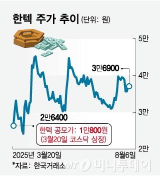 7일 한국거래소(KRX)에 따르면 전날 코스닥 시장에서 한텍은 3만6900원에 정규장 거래를 마감했다. 공모가(1만8000원)대비 241.67% 급등한 것이다. 공모가 기준 약 1억원어치를 청약받았다면 넉 달 사이 3억7000만원으로 불어난 셈이다.