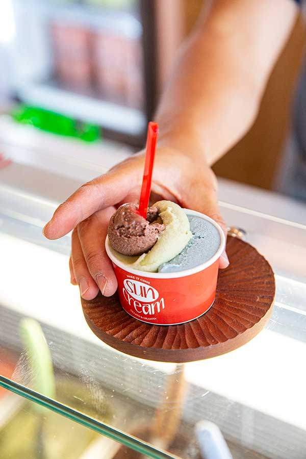 노을, 땅, 산, 바다. 특이한 시그니처 맛을 가진 천진 최고의 디저트집. 색도 맛도 끝내준다. 특히 들기름메밀 젤라또는 처음 먹어보는 맛과 풍미로 모두를 감탄하게 만들었다. 고소한 들기름과 메밀 향이 입안을 가득 채운다.천진리를 다시 찾게 만들 맛이다.