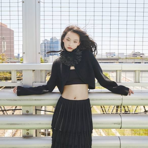 니트 카디건, 스커트, 플라워 목걸이 모두 가격미정 Alaïa. 톱 핸들 백 가격미정 Bottega Veneta. 이너 톱 에디터 소장품.