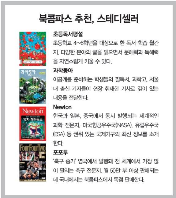기존 카테고리 가운데는 교육 분야를 강화하기로 했다. 기존에는 EBS 교재 등 교육 관련 잡지 판매에만 주력했지만 앞으로는 학생과 수험생에게 도움이 될 수 있도록 논술과 진로, 수시 및 정시 관련 콘텐츠를 집중적으로 제공하기로 한 것이다.한국 미래를 이끌 다음 세대의 지식과 사고력 향상을 위해서는 다음세대에듀(대표 이지현)와 협력하기로 했다. 프랑스식 교육법을 바탕으로 논리적 사고와 글쓰기 능력을 키우는 독서 논술 교재 '다음세대논술'을 북콤파스에서 판매하는 한편, 5월 '제1회 다음세대논술왕' 논술대회를 열어 12명 수상자를 배출했다. 양사는 앞으로도 매년 '다음세대논술왕'을 함께 개최하기로 했다.
