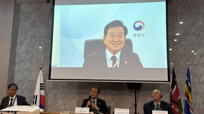 ▲ 6일(현지시간) 케냐 나이로비국립대학 UN타워에서 열린 세계코리아포럼에서 정동영 통일부 장관이 영상으로 기조연설하고 있다.