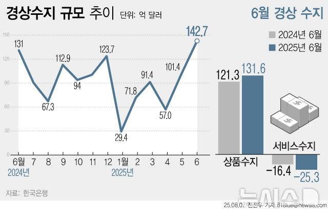 [서울=뉴시스] 7일 한국은행에 따르면 올해 6월 우리나라 경상수지는 142억7000만 달러 흑자를 기록했다. 반도체 수출 호조에 힘입은 역대 최대 흑자다. 26개월 연속 흑자로 2000년대 들어 세번째로 긴 연속 흑자기도 하다. 한국은행은 올해 하반기부터 미 관세가 본격적으로 영향을 미칠 것으로 봤다. (그래픽=전진우 기자)