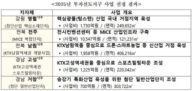 국토교통부는 2025년 지역개발사업 공모를 추진한 결과 △투자선도지구 사업 5곳 △지역수요맞춤지원 사업 20곳을 선정했다고 7일 밝혔다. 이곳은 5월 공모 접수를 시작으로 서면·현장·종합평가를 거쳐 총 25곳을 최종 선정했다.