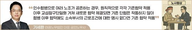 끝으로 합병 이후 입사하는 근로자에 대해서는 원칙적으로 창구단일화절차를 통해 교섭, 체결한 단체협약이 적용될 것이나, 본인이 속한 소속부서의 근로조건에 대한 사항이 협약에 명시되지 않은 사항에 대해서는 기존 단체협약의 근로조건이 해당 조직내 규범으로 자리잡고 있을 것이어서 해당 규범으로서의 근로조건이 적용될 것이다.