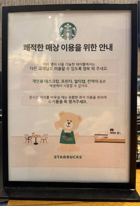 이에 따라 스타벅스 매장에서는 프린터나 멀티탭 등 과도한 장비를 사용하거나, 테이블 위에 칸막이를 세우는 등의 행위를 하는 고객에게 매장 파트너가 구두 안내 조치를 할 예정입니다.
