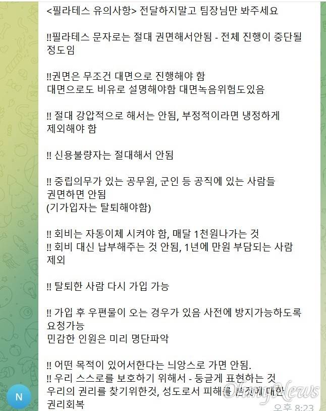| ▲ 신천지가 신도들을 국민의힘 책임당원으로 가입시키기 위해 내려보낸 지시 사항. 2023년 10월 경 신천지 내 팀장 텔레그램에 올라온 '필라테스 유의사항'이라는 이름의 공지다. 신천지 전직 고위 관계자 A씨는 '필라테스'라는 단어를 두고 운동 목적인 것처럼 보이기 위해 내부적으로 쓴 은어라고 설명했다. |