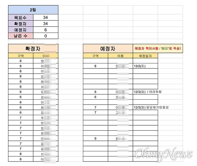 | ▲ 신천지 전직 고위 관계자 A씨는 신천지 신도들을 국민의힘 책임당원으로 가입시키기 위해 팀별로 가입 명단을 작성해 관리했다. 사진에 나오는 2팀의 경우 해당 시기 당원 가입 확정자를 목표수에 맞춰 채운 것을 확인할 수 있다. |