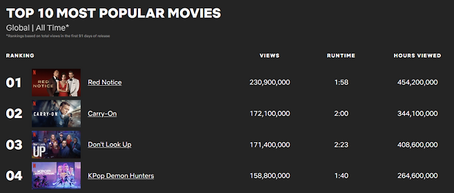 7일 넷플릭스 투둠 사이트에 따르면 ‘케이팝 데몬 헌터스’는 누적 시청수 1억 5880만 회를 기록했다. 누적 시청 시간은 2억 6460만 시간으로 넷플릭스 글로벌 영화(영어) 부문 4위에 등극했다. 역대 1위는 2억 3090만 회를 기록한 ‘레드 노티스’이며 2위와 3위는 ‘캐리온’(1억 7210만 회), ‘돈 룩 업’(1억 7140만 회)다.