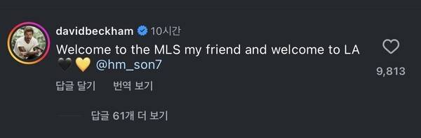 특히 눈길을 끈 이름은 베컴이었다. 베컴은 "MLS와 LA에 온 걸 환영해. 내 친구"라며 하트까지 덧붙였다. 해당 댓글은 7일 오후 5시 기준 약 1만 개에 육박하는 좋아요를 받으며 화제가 되고 있다. 무엇보다 베컴이 LAFC의 경쟁팀인 마이애미 구단주라는 점을 감안하면 무척 이례적인 환영 인사인 셈이다.