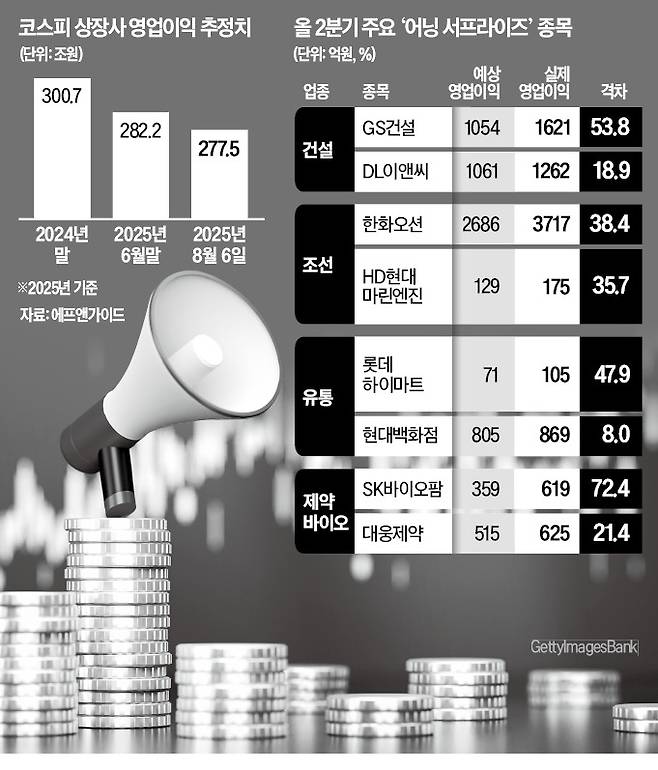 올 2분기 실적 시즌이 한창인 가운데 상장사의 영업이익이 전망치를 밑도는 것으로 나타났다. 증권가에선 관세·증세 우려를 딛고 ‘어닝 서프라이즈’(깜짝 실적)를 낸 종목에 주목하라는 조언이 나온다. 업종별로는 건설, 조선, 유통, 제약·바이오의 실적이 증권가 예상치를 뛰어넘은 것으로 집계됐다.