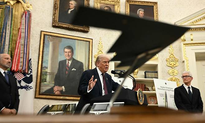 | 애플 1000억弗 투자 계획 발표 도널드 트럼프 미국 대통령(가운데)이 6일(현지시간) 워싱턴 백악관 집무실에서 팀 쿡 애플 최고경영자(CEO·오른쪽), 하워드 러트닉 상무장관이 지켜보는 가운데 애플의 미국 제조, 공급망 확대를 위한 투자 계획과 함께 반도체 100% 관세 부과 방침을 밝히고 있다. 관세를 통한 국제질서 재편을 이끄는 미국의 막강한 힘을 상징하는 듯 세계 유일의 다목적 스텔스 폭격기 B-2의 모형이 카메라에 잡혔다. 워싱턴=AFP연합뉴스 |
