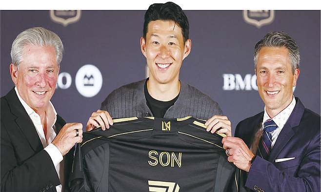 | ‘레전드’의 새 출발 손흥민(가운데)이 7일(한국시간) 미국 캘리포니아주 로스앤젤레스(LA)의 BMO 스타디움에서 열린 LAFC 입단 기자회견에서 베넷 로즌솔(왼쪽) 공동 구단주, 존 소링턴 단장과 함께 등번호 7번이 새겨진 유니폼을 들고 기념촬영을 하고 있다. LAFC 제공 |