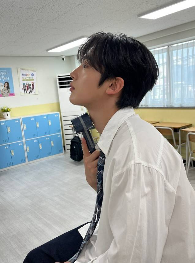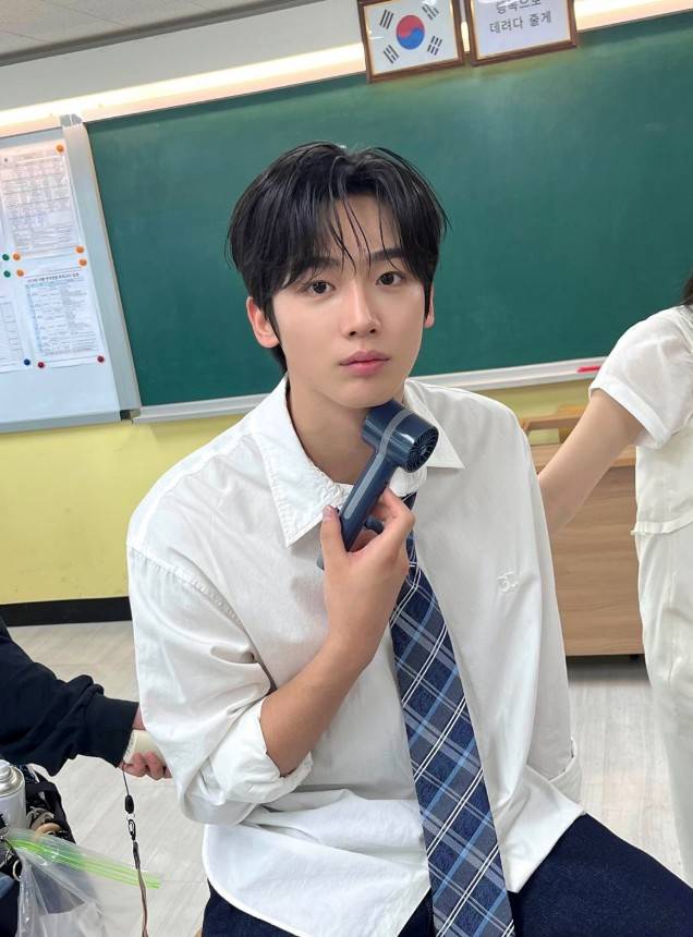 공개된 사진 속 김요한은 화이트 셔츠에 블루 체크 넥타이를 매치한 단정한 교복 차림으로 손에는 미니 선풍기를 들고 더위를 식히고 있다. 흐트러진 앞머리와 맑은 눈빛은 앉아 있는 자세마저 화보처럼 보이게 한다.