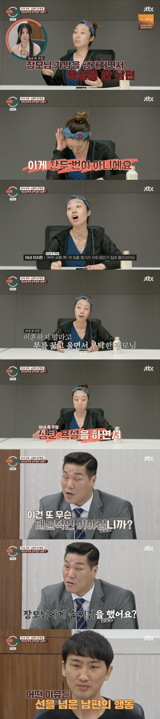 아내는 남편이 장모님의 가방을 팽개치며 욕설을 퍼부었고, 심지어 손찌검까지 했다고 밝혔다. 특히 장모님이 이혼을 만류하며 무릎까지 꿇었는데도 이 같은 폭력을 행사했다고 전해 충격을 더했다.
