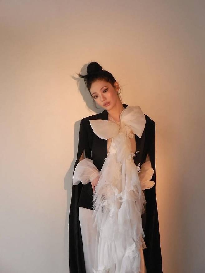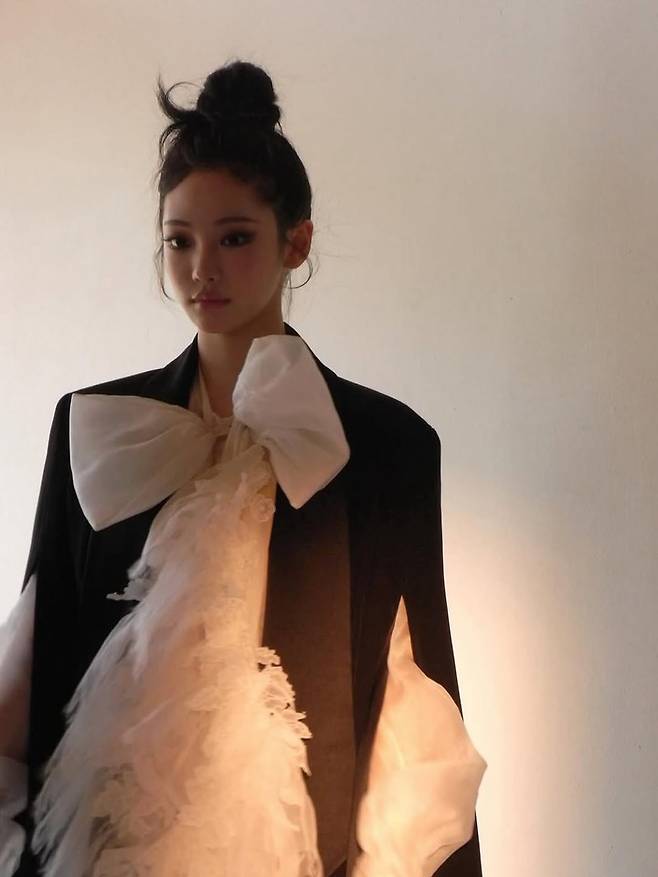 사진 속 닝닝이 착용한 의상의 거대한 화이트 리본이 시선을 사로잡는다. 블랙 드레스 위에 시폰 러플 장식을 더해 강렬하면서도 우아한 인상을 주고, 정수리 위로 올려 묶은 번 헤어로 마치 현대미술 속 인물처럼 강한 예술적 분위기를 만든다.