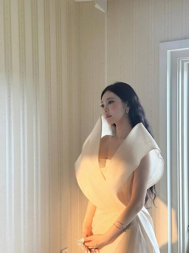 마지막 컷에서 닝닝은 베이지 톤의 입체적인 드레스를 착용해 조용한 아름다움을 드러낸다. 자연광이 들어오는 공간 속에서 단아하면서도 고혹적인 분위기를 극대화한다.