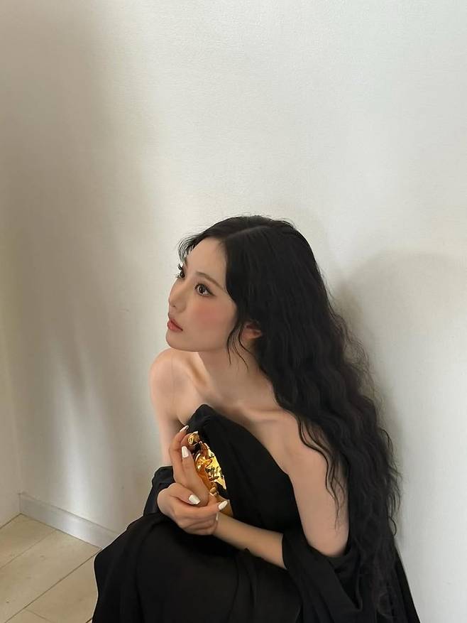바닥에 앉아 측면을 응시하는 닝닝의 모습은 정적인 듯 강렬하다. 검은색 오프숄더 드레스에 더해진 긴 흑발은 자연스러운 굵은 웨이브로 연출돼, 몽환적인 이미지를 배가시킨다.