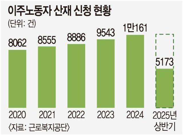 외국인 노동자 산재 신청은 5년 연속 증가세다. 2020년 8062건, 2021년 8555건, 2022년 8886건, 2023년 9543건, 지난해 1만161건을 기록했다. 노동 당국은 외국인 산재 신청은 올해도 증가세를 이어가 지난해 수치를 넘어설 것으로 내다봤다.