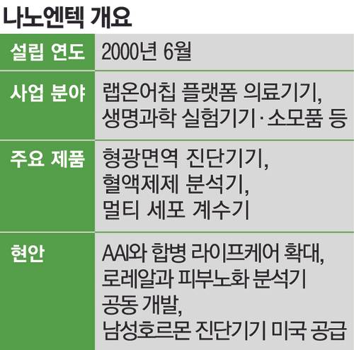 한편 나노엔텍은 글로벌 뷰티업체 로레알과 협력해 피부 진단기기 셀바이오프린트를 개발하고 있다. 피부세포 내 특정 바이오마커를 진단해 노화 정도를 파악하는 기기다. 로레알은 내년 랑콤 매장을 방문하는 소비자를 대상으로 피부 진단 서비스를 선보일 예정이다.